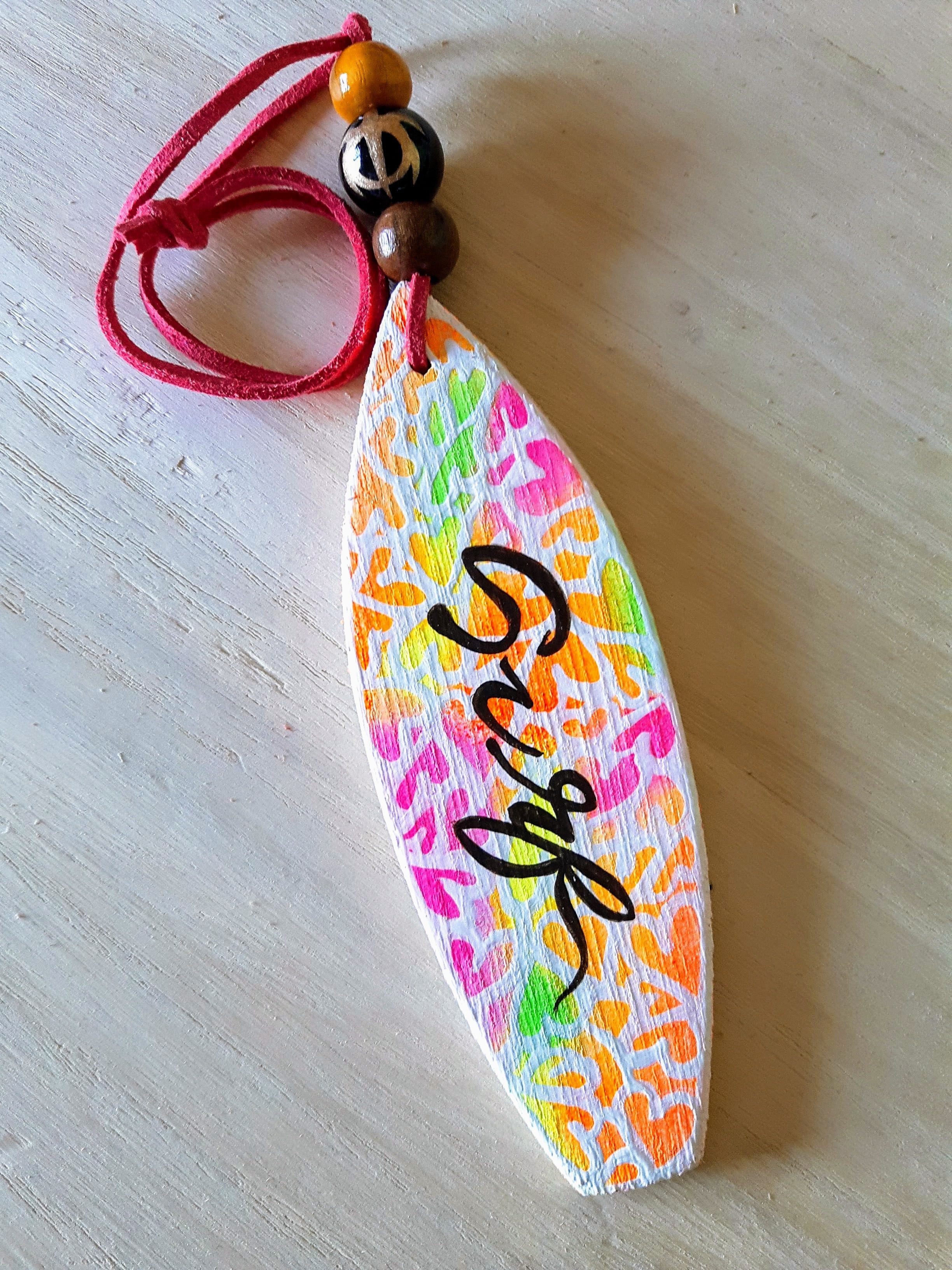 パイナップル型とサーフボードの木型に手描きでカラフルに描いています。